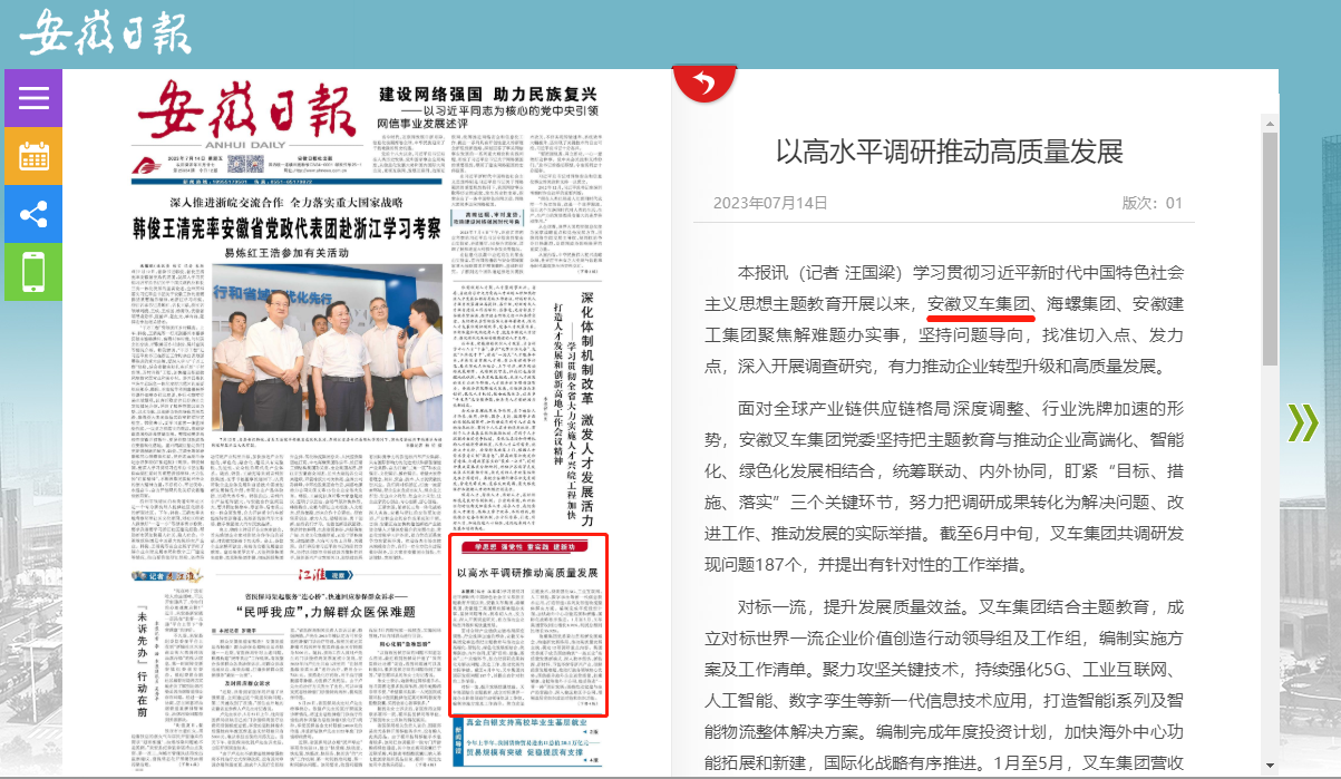 7月14日,《安徽日報》在頭版中就安徽叉車(chē)集團以高水平調研推動(dòng)高質(zhì)量發(fā)展情況進(jìn)行了報道。報道中表示,學(xué)習貫徹習近平新時(shí)代中國特色社會(huì )主義思想主題教育開(kāi)展以來(lái),安徽叉車(chē)集團聚焦解難題辦實(shí)事,堅持問(wèn)題導向,找準切入點(diǎn)、發(fā)力點(diǎn),深入開(kāi)展調查研究,有力...